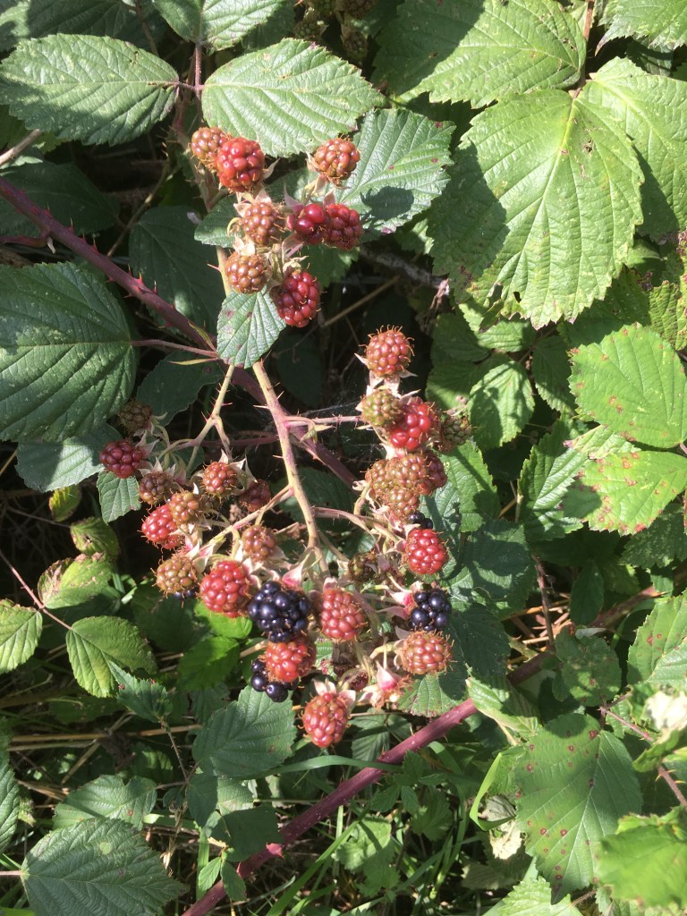 As if that wasn’t pleasure enough, I discovered that the first blackberries are appearing. Thanks to the deluge last month, many of them are fatter and juicier than ever. Taking a somewhat battered old ice cream container with me was all the preparation required. In one outing, I had filled it to the top while walking less than a mile. I returned home juice-stained and scratched, but very satisfied. No one else seemed interested in gathering these dark jewels of wonderfulness, so there was no competition. True, the birds had got to a couple before me, but nothing serious.