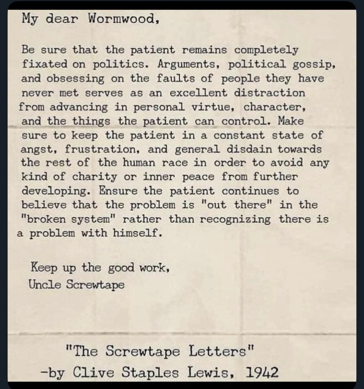 CS Lewis, in his brilliant The Screwtape Letters, wrote with great insight about how the dark forces of spirituality might work their will to bring about the destruction of humanity. The premise of the book is that an old devil is mentoring his apprentice nephew through a series of letters, encouraging him to learn the best way to cause destruction in the world, particularly among people of faith, referred to as ‘the patient’.